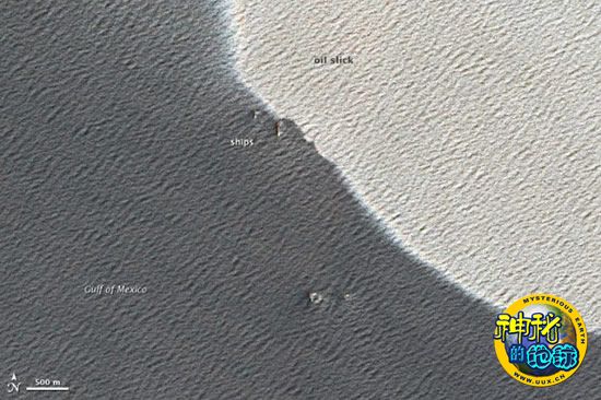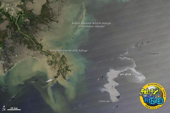 据美国宇航局官网报道,2010年4月20日,墨西哥湾的一座美国钻井平台发生爆炸,并最终导致沉没。4月下旬,倾覆入海的钻井平台估计每天向外泄露原油4.2万加仑,原油泄露对墨西哥湾海域造成了严重污染。4月25日,美国宇航局“Aqua”卫星和“地球观测1号”卫星分别捕捉到墨西哥湾原油污染区的画面。