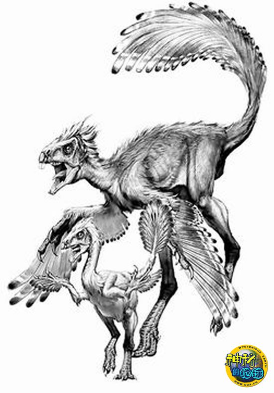 这两件标本上的羽毛明显不同:小个体标本上的飞羽和尾羽都属于一种近端带状正羽,只有初级飞羽,尾羽明显大于飞羽;大个体标本上的飞羽和尾羽都呈现典型的正羽形态,飞羽除了初级飞羽,还有次级飞羽,尾羽和飞羽大小差别也不明显。