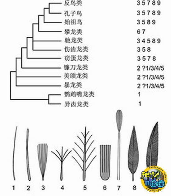 现代飞羽由羽轴和羽片组成,以我们常见的鹅毛为例,中间一根粗壮的羽轴,羽轴两侧分布着由一根根细小的羽枝组成的羽片。无论幼年个体还是成年个体,飞羽的形态总是这样的。然而,在似尾羽龙小个体上发现的羽毛印痕,其远端与现代羽毛一致,靠近身体的近端却没有羽片和羽轴的分化,是类似于鳞片样的平平的板状。