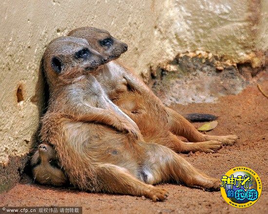 两只猫鼬坐在同类身上晒太阳 来源: 神秘的地球 时间:2010年4月30日 10:37 两只猫鼬坐在同类身上晒太阳 2010年4月28日消息,73岁的摄影师Charlie Summers日前在澳大利亚悉尼的塔朗加动物园拍到了这个令人称绝的画面。两只猫鼬舒服地坐在另一只猫鼬的身上晒太阳。而这个倒霉鬼被迫仰躺在墙根当“坐垫”,根本就无法逃脱。 China Foto Press 上一篇 下一篇 TAG: 猫鼬