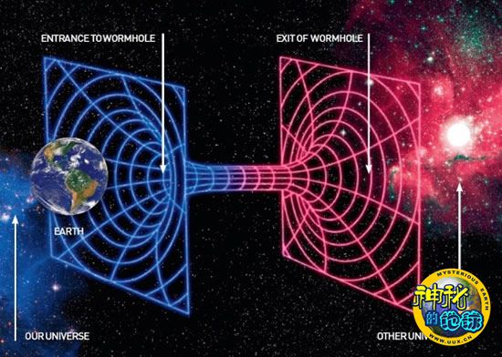 虫洞是根据爱因斯坦相对论预测的连接时空中两个不同地点的假想“隧道”或捷径,上面的三维图轮廓集中呈现了这一点:负能量将时间和空间拖入一条隧道入口,并在另一个宇宙出现。虫洞至今仍是一种假设,因为从没有人见过,但在一些电影中被描述成时间旅行的通道,比如《星际奇兵》(1994年)和《时光大盗》(1981年),前者将虫洞描述成宇宙之间有门的隧道,后者则是天体图中展现了虫洞的位置