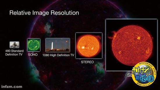 SDO与普通电视、高清电视以及其他两种观测卫星的分辨率对比图