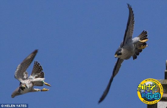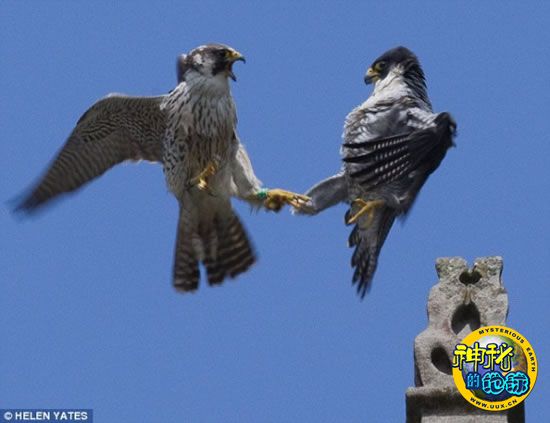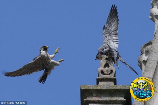 在万里无云的蓝色天幕映衬下,两只雄游隼仿佛定格在那里,就像是旁边盾形纹章上的图案一样。事实上,这是在西苏塞克斯郡奇切斯特大教堂上方250英尺(约76.2米)高的空中进行的激战场景----一只年轻的游隼想要侵占一只教堂“常客”的巢穴领地。