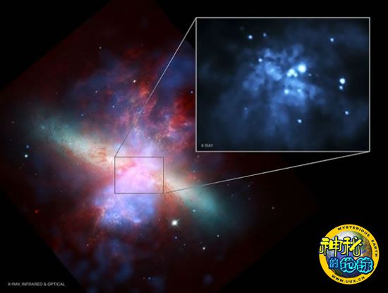 在一个“宇宙雪茄”深处,天文学家发现两个新的中量级天体,可能就是两个黑洞。这幅雪茄星系M82的新照片展示了一对天体,似乎就是两个所谓的中等质量黑洞。照片于4月29日公布,将来自美国宇航局钱德拉X射线太空望远镜捕获的可见光以及哈勃太空望远镜侦测到的红外线结合在一起。