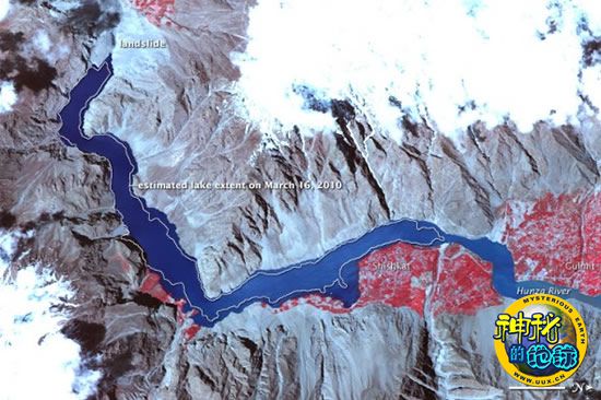 据美国宇航局网站报道,巴基斯坦北部2010年1月4日发生山体滑坡,导致罕萨河被堵,形成一个堰塞湖。随着温度上升,冰雪融化,湖水可能会冲破土坝,形成大洪水,对下游村庄造成严重威胁。