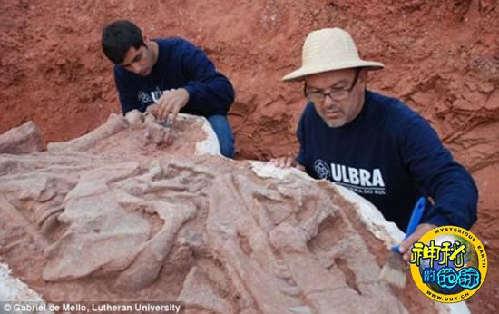 两位古生物学家正在评估露在外面的迅猛鳄化石。他们希望化石可以继续留在巴西保存