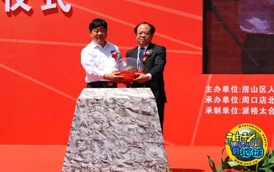 国家文物局局长单霁翔将模型交给周口店遗址博物馆馆长杨海峰