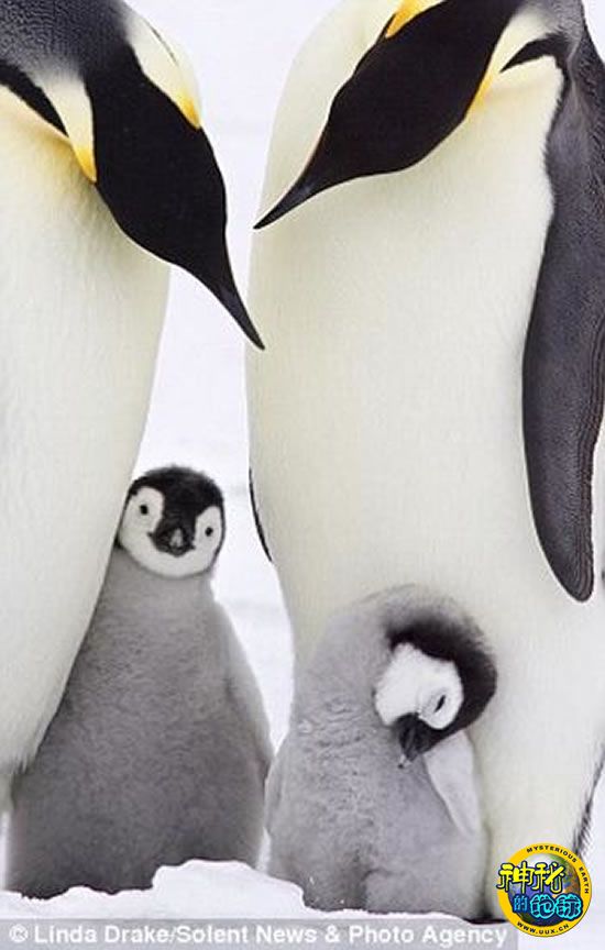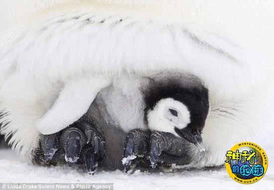 成年企鹅小心地把自己的孩子放置在双腿间,用腹部的脂肪和羽毛盖得严严实实。幸福的新生小企鹅沐浴在父爱母爱的阳光下,似乎丝毫没有感受到生活环境的严酷。