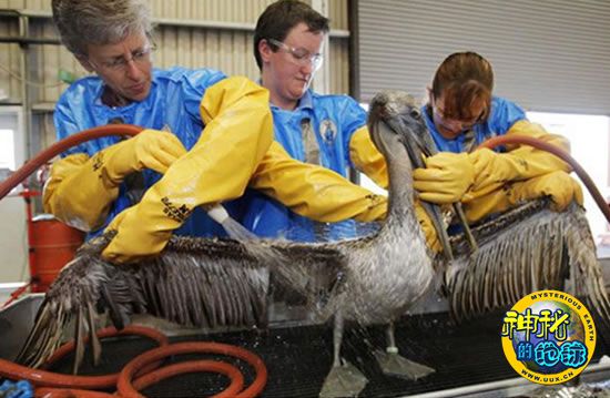 兽医海瑟·奈维尔(右)和天然资源保护论者丹尼斯·比提尔正在为一只海鸟清洗。