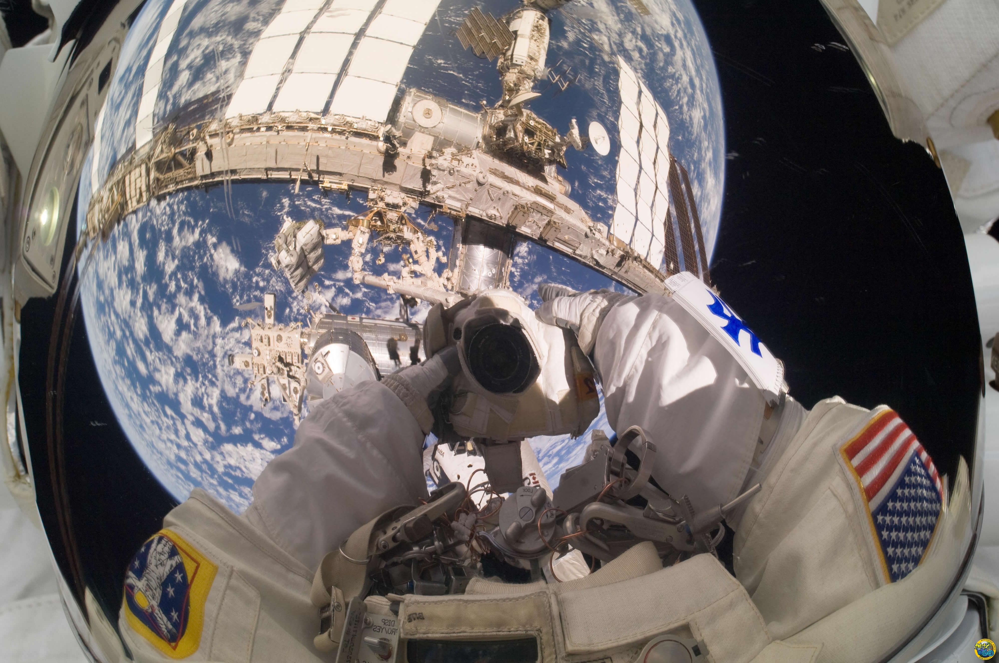 宇航员头盔上映射出的地球和国际空间站