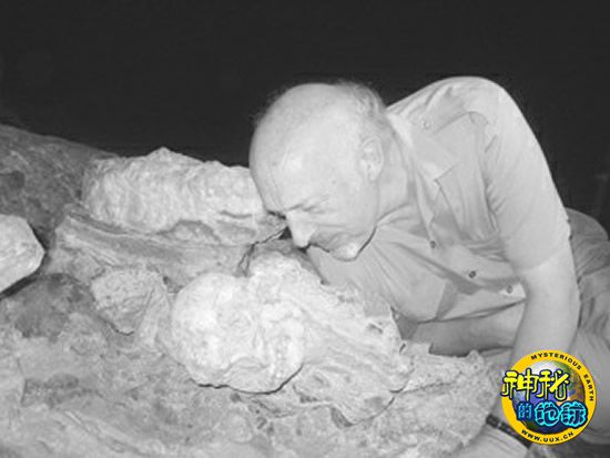 我们随着教授走下长长的阶梯,进入潮湿的岩洞,迎面就是大铁门,一般参观者到此就要止步了。我们穿过铁门,教授的两位黑人助手在前面引路,我们就随着大电筒的光束,来到挖掘现场,最先看到的是那只“小脚”,教授的胫骨模型,正好和“小脚”的接口相衔接,他们就从这里开始,一点一点地把整个骨架清理出来。当灯光照着古猿全身时,我真的屏住呼吸了,教授又详细地给我讲述了挖掘过程,然后他双膝落地,倾身侧俯在“小脚石化”之上,把自己的头放在化石头骨旁。女儿笑着说:“他们是一双‘睡美人’。”克拉克教授解释道:“这样你们就能对比头骨的大小了。”