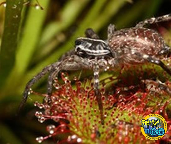为了争夺食物,一只狼蛛趴在食肉茅膏菜的叶片上。