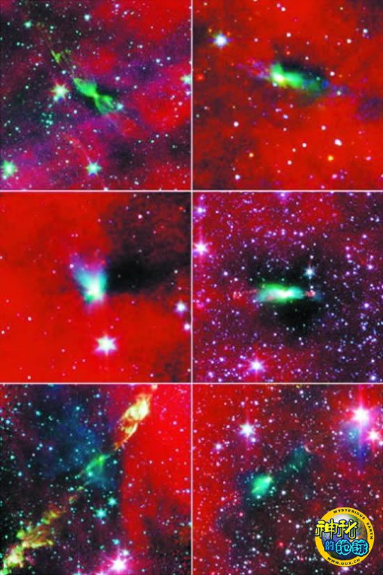 天文学家利用斯皮策空间望远镜发现——其装载的红外线探测仪能够穿透尘埃云的遮蔽并探测内部进程,在他们观测的20个原恒星云中,有17个云团都被拉得很长,而且另外3个云团也不是彻底的球形。这将有助于解释为什么银河系中的大多数恒星系统都是二元的。上图展示了其中的6个双星系统。