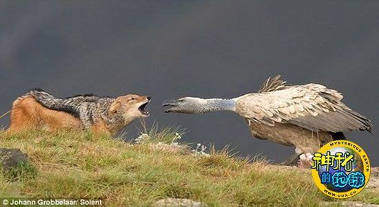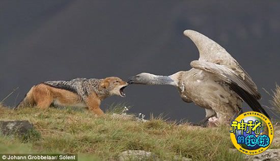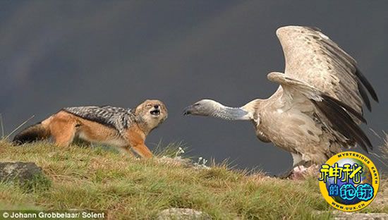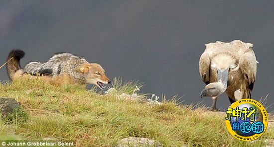 野生动物摄影爱好者里瑞特和约翰·夫妇近日在南非当地一个野生动物保护区内,拍摄到一组极为罕见的“豺狼与秃鹰争斗狠”的现场照片。