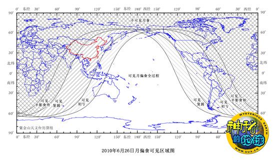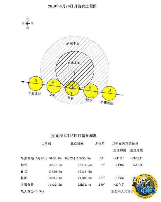 发生在6月26日的月偏食,在亚洲东南部、印度洋东部、大洋洲、太平洋、南极洲、北美洲西南部和南美洲西部都能看到。本次月偏食最大食分为0.542,较1月1日那次大很多。美中不足的是只有我国东南部地区可以看到带食月升,观测条件一般。