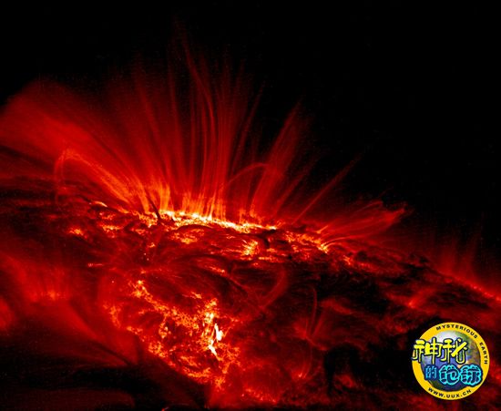在色球上,人们还能够看到许多腾起的火焰,这就是所谓的 日珥 。 日珥 是太阳天体上的一种活动现象,它的变化极为迅速,一次完整的 日珥 过程一般为几十分钟。 日珥 的形状是千姿百态,有的如浮云烟雾,有的似飞瀑喷泉,有的如一弯拱桥,也有的像团团草丛,真是举不胜举。根据形态变化规模的大小和变化速度的快慢天文学家将日珥分成宁静日珥、活动日珥和爆发日珥三大类。最为壮观的当为爆发日珥,原本宁静或活动的日珥,突然 怒火冲天 ,将气体物质拼命往上抛射,然后回转着返回太阳表面,形成一个环状,因此,爆发日珥也称环状日珥。