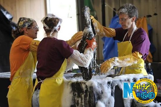 然而,在记者面前,第36号小家伙满身油污地站在水池边上,完全失去了往日的风采。身下的白毛巾已经被它踩脏,污渍斑斑。鸟类专家埃里卡·米勒和两位同事把清洗剂喷洒在它身上。
