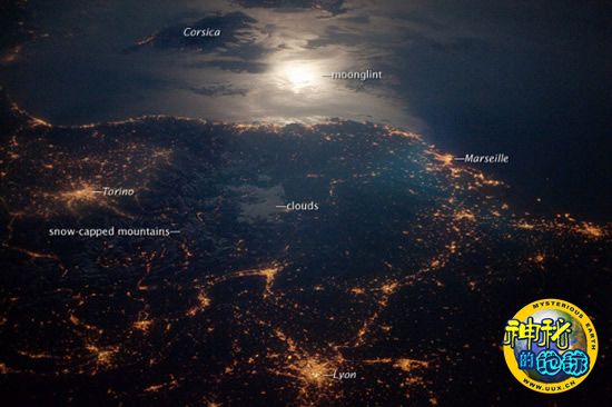 据美国宇航局官方网站报道,国际空间站宇航员捕捉到一张法意边境夜景图。在图片中,法国马赛、里昂和意大利都灵等大都市灯火阑珊,周围环绕着小城镇,而月亮也发出皎洁的光芒。这幅美轮美奂的夜景图,给人以美的遐想。