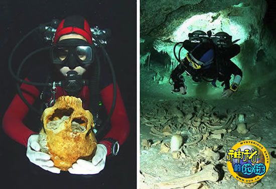 左图,在一个墨西哥洞穴中,一位潜水人员手捧在海底发现的人类骨头。右图,一位潜水人员在一个灰岩坑的人类遗骸附近游泳。