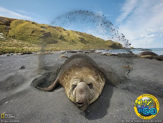 在南乔治亚岛,一头雄性南方象海豹在鳍状肢挖出的沙坑纳凉。南乔治亚岛是英国的偏远前哨,位于大西洋远端,是数百万海鸟和海豹的天堂。