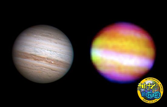 5月26日,在执行首次科学任务中,SOFIA望远镜在3.5万英尺(约合1.07万米)的高空进行了长达八小时的观测。SOFIA望远镜在这次任务中拍摄了大量红外照片,其中一张就是独特的木星彩色照片,以前所未有的清晰度展现了这颗行星的热量(图右)。而地面望远镜最近拍摄的一张可见光照片则显示木星上的云团所呈现奇特的条状(图左)。