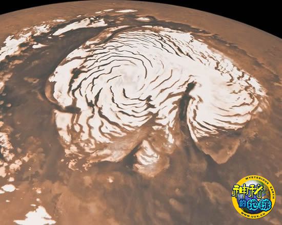 The swirling troughs of Mars's north polar ice cap are seen above in a recently released picture from the no-longer-operating Mars Global Surveyor orbiter, whose mission was terminated in 2007.