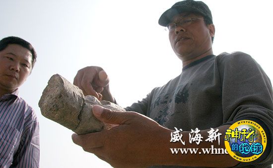 中国科学院古脊椎动物与古人类研究所汪筱林研究员(右)在2号恐龙化石发掘地向威海晚报记者潘翔介绍情况。