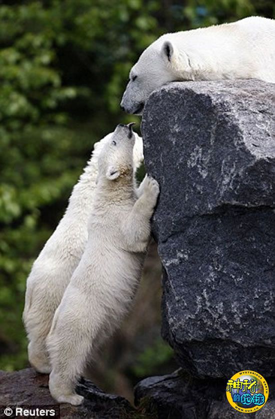 在动物园的北极栖息区,两个北极熊宝宝与母亲一同在观众面前出现。其中一个甚至两条后腿站在下面,身子爬在岩石上,向母亲索吻,而另一个则与母亲打成一片。在相互追逐打闹许久以后,两个小家伙看上去有些累了,就与母亲依偎在一起。两个北极熊宝宝出生于2009年11月30日,但直到本周,圣费利西安动物园才允许公众首次近距离与它们接触。