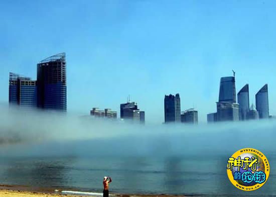 2010年6月6日,在青岛第三海水浴场附近出现彩色平流雾奇观。