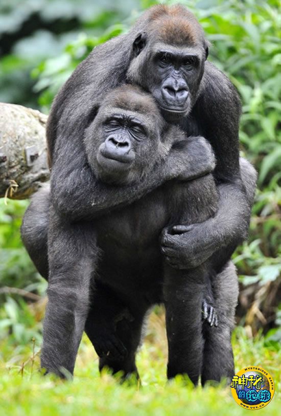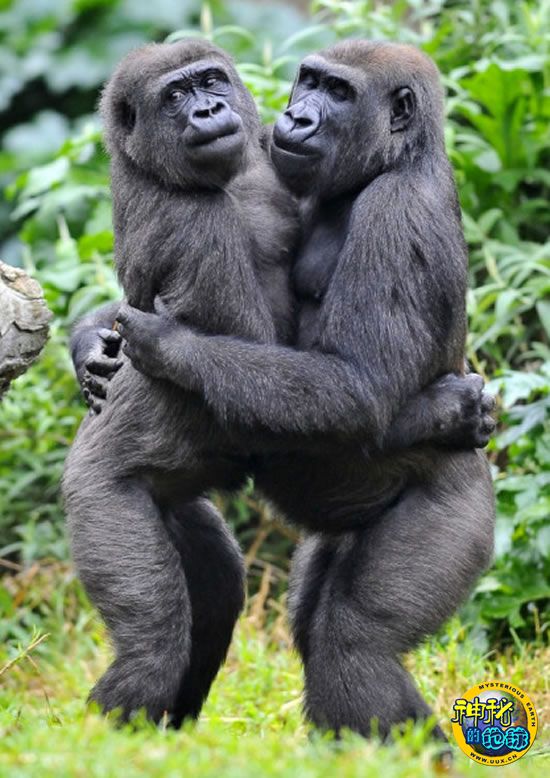 两只大猩猩初次见面拥抱示好