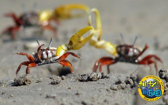 “嗨,我在这儿!”当雄招潮蟹(Uca mjoebergi,如上图)看到远处的一只雌蟹时,它们会比平时频繁20倍地狂热挥舞自己一支独螯,旨在吸引对方的注意。据美国《科学》杂志在线新闻报道,如今,一项新的研究表明,为了搞清潜在伴侣的下落,这些雄蟹甚至还会“偷听”竞争对手的”谈话“。研究人员观察了50场这样的遭遇战,发现当一只雄蟹看到另一只雄蟹在挥舞求偶螯后,便也会挥舞自己的求偶螯——即便它并没有真的看到雌蟹到底在哪儿。科学家推断,偷听让招潮蟹在爱的世界中有了更多的机会。研究人员在《生物学快报》网络版上报告了这一研究成果。