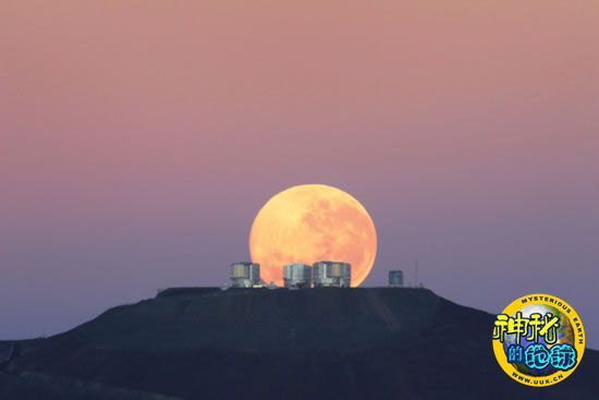 当位于智利的欧洲南方天文台天文学家结束一个夜晚的繁忙观测工作后走出天文台时,他们发现一轮壮观的满月悬挂于阿塔卡马沙漠上空。满月比平常显得更大更圆,天文学家认为这只是一种错觉。但是,大如圆盘的满月与欧洲南方天文台的甚大望远镜交相辉映,形成一幕壮观的景象。天文学家及时拍下了这一罕见的壮观场景,并于近日公开了这张照片。