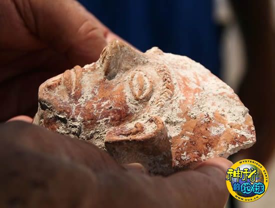 "The face was part of a vessel in which libations were offered to the god or goddess of that temple. It is not assumed to be a face of the god or goddess, but is probably of one of the worshipers who gave this as a gift to the gods."