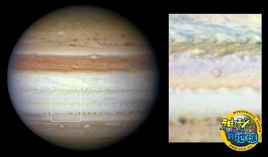 To investigate the size of the impact, Hubble's ultraviolet and visible-wavelength cameras were called into action three days after the blast. However, they found no telltale black smudges, such as those seen after a 1,640-foot-wide (500-meter-wide) asteroid had struck Jupiter in July 2009.