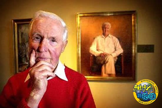 弗兰克·芬纳教授站在澳大利亚首都堪培拉的国立大学微生物学院自己的油画像前。