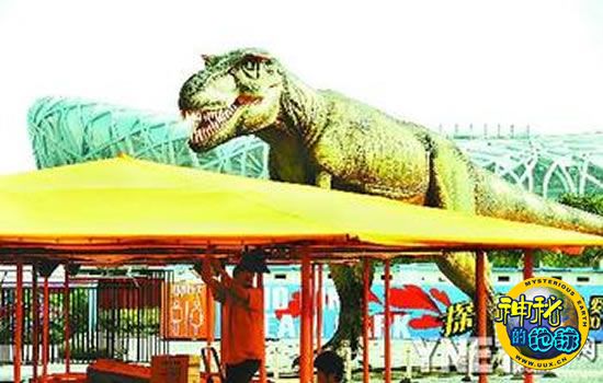 昨天下午,奥运中心区北侧的广场上出现了几只十米高的巨大橡皮恐龙,这是正在搭建的探梦恐龙岛主题公园的道具。在鸟巢的背景下,橡皮恐龙们显示出特有的魔幻色彩。