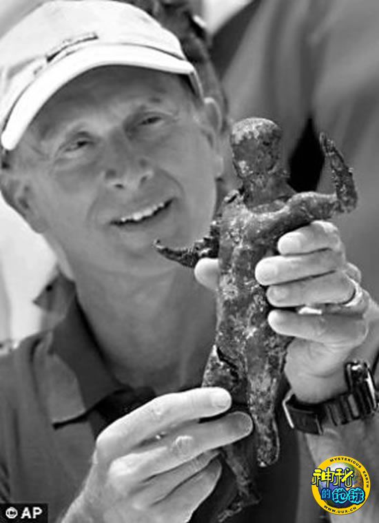 法国水下考古学家弗兰克·戈迪奥展示一个从伊希斯神庙新出土的铜像。