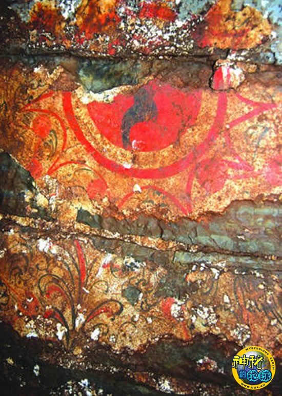 让考古人员感到惊喜的是,该墓为一壁画墓,除墓底外,墓室内绘满壁画,虽然由于长期泥水浸蚀,大多图案已不清晰,甚至局部存在脱落现象,但从残留痕迹推敲,该壁画墓的主题内容为天象类的日、月、星宿、云气等,墓顶中部代表天空,下部象征山川大地,墓顶中部有一色彩明艳的圆形图案,内有金乌,做展翅飞翔状态,其四周云气环绕,星宿图案在墓室的前端延伸到墓壁的两侧;在北壁前端发现模糊不清的人像图案,有的见头部、有的是腿部、有的目视前方,有的双腿后蹬像在奔跑,这些人物衣着整齐,形象逼真,根据上述迹象推测有可能是在狩猎,墓室后端及两侧墓壁也有一些祥瑞图,如灵芝、瑞草等。
