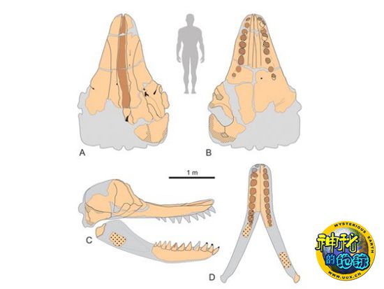 这张图详细说明了麦尔维尔鲸的头骨和颌骨结构,其上下颚都有巨大的牙齿,足以放下一个人。相比之下,现代的抹香鲸牙齿更小,而且主要集中于下颚——这是为适应捕食乌贼所做的改变。美国纽约理工学院鲸鱼进化专家乔纳森-盖斯勒(Jonathan Geisler)说,麦尔维尔鲸的特征表明,“海洋食肉动物确实进化拥有了超大的体型。”