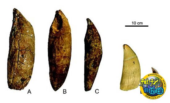 A,B和C牙齿为麦尔维尔海怪的牙齿,D和E牙齿为现代抹香鲸的牙齿