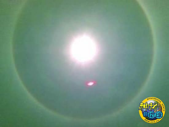 “在出现日晕的时候,我还看见了UFO,它在两个日晕光环中穿梭!”有网友在西祠论坛上发帖,并把手机拍下的飞行物贴到了网上。“你看它越飞越近,到了太阳底下还发出了火红色的光,会不会是飞碟的动力系统着火了?”