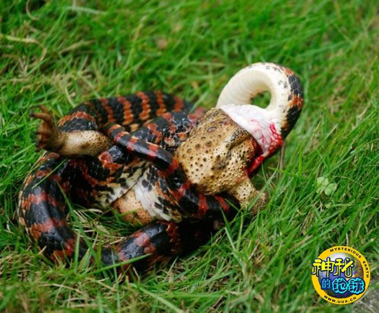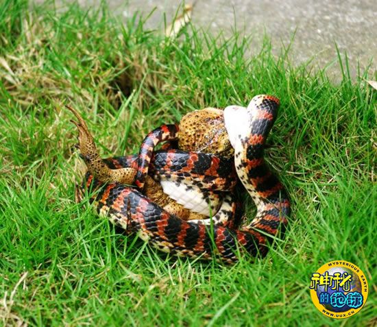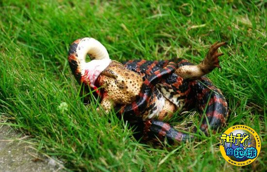 赤练蛇要吞大蟾蜍 来源: 神秘的地球 时间:2010年7月06日 11:10 赤练蛇要吞大蟾蜍 赤练蛇要吞大蟾蜍 赤练蛇要吞大蟾蜍 7月4日,无锡某单位草坪上一只半米多长的赤练蛇缠住一只蟾蜍。开始蟾蜍还不停挣扎,在蛇的紧紧缠绕下慢慢没了动静。然后蟾蜍太大,蛇无法吞噬,最后只好放弃。 人民视线 上一篇 下一篇 TAG: 蟾蜍 赤练蛇