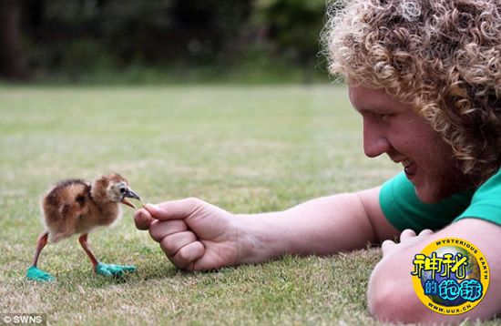 天堂公园负责人戴维-乌尔科克(David Woolcock)说:“一开始,看到小皇冠鹤的脚趾有些弯曲,我们就给它装上了绑带,试图帮助矫正脚趾。小皇冠鹤做得非常好,目前到处卖弄这双绿色的特制鞋。有时,饲养员会带着小皇冠鹤来到公园中心的‘格伦摩尔屋’前面的草地散步,帮助它强化两条腿的力量。”