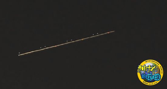 “照片上‘不明飞行物’拉出的一道红线为机翼左侧的航行灯,而几个白色的小点,则是高亮度白色频闪灯,又叫做高亮度白色防撞灯,相对的,在另一侧的机翼上也装有这个灯,仔细看照片可以看到。至于亮度最高的白色灯光,其实是飞机降落时打开的降落灯射出的光柱,光柱亮度很高,加上照相机慢门拍摄,就拉出了一道最亮的白线。”