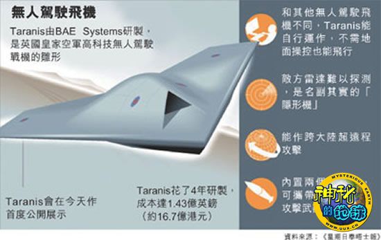该无人驾驶飞机名为Taranis,是雷电之神的名字。Taranis由BAE Systems联同Qinetiq、劳斯莱斯和GE Aviation花了4年时间研制,成本达1.43亿英镑,将于明年作飞行测试。