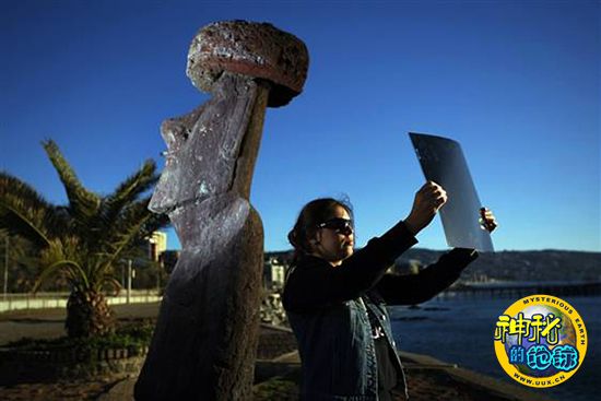 一名女孩站在复活岛上,手持一张X光片观测日全食。