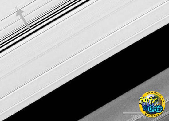 就像喷气式飞机在天空中留下凝结尾一样,小行星同样也会在土星最外侧的A环上留下痕迹(如上图箭头所示)。