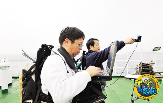 7月12日,美国得克萨斯大学的谢红接(前)和南京大学的柯长青(后)在“雪龙”号上用光谱仪测量太阳辐射。新华社记者 张建松摄