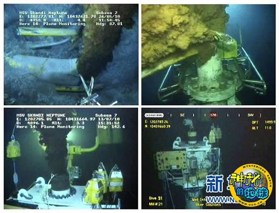 拼版照片显示的是英国石油公司实时水下现场监控于2010年5月26日(左上)、6月1日(右上)、7月13日(左下)及7月15日拍摄到的漏油情况。在墨西哥湾漏油事件发生近3个月后,英国石油公司7月15日宣布,新的控油装置已成功罩住水下漏油点,“再无原油流入墨西哥湾”。