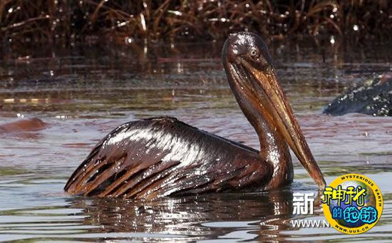 6月6日,在美国路易斯安那州一处海湾,一只浑身沾满墨西哥湾泄露原油的鸬鹚在水面游弋。美国政府5日公布最新数据显示,清理人员已在墨西哥湾海域发现有547只鸟死亡,而实际死亡数量可能远超现有统计数字。